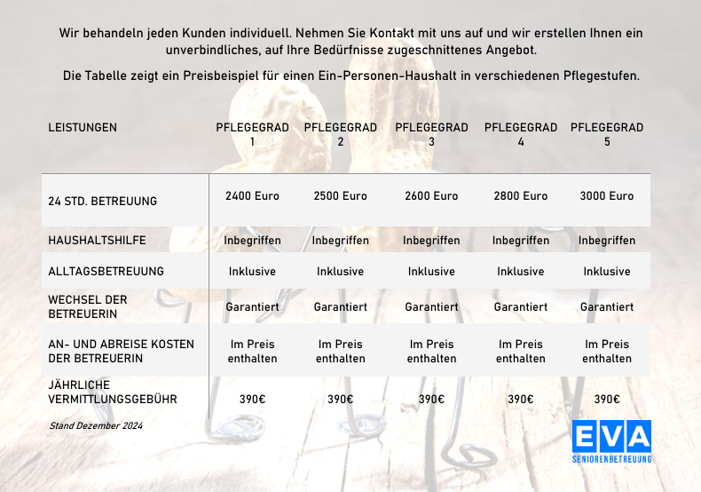 Wir als Europäische Vermittlungsagentur (EVA) für Seniorenbetreuung haben uns zu Herzen genommen, betreuungsbedürftige Senioren dabei zu unterstützen, ein möglichst weiterhin uneingeschränktes Leben in gewohnter Umgebung genießen zu können.
